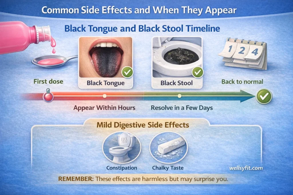 One of the most noticeable effects is darkening of the tongue or stool. This can appear within hours of the first dose and usually resolves within a few days after stopping.